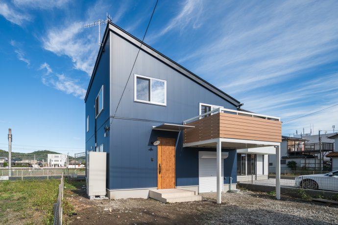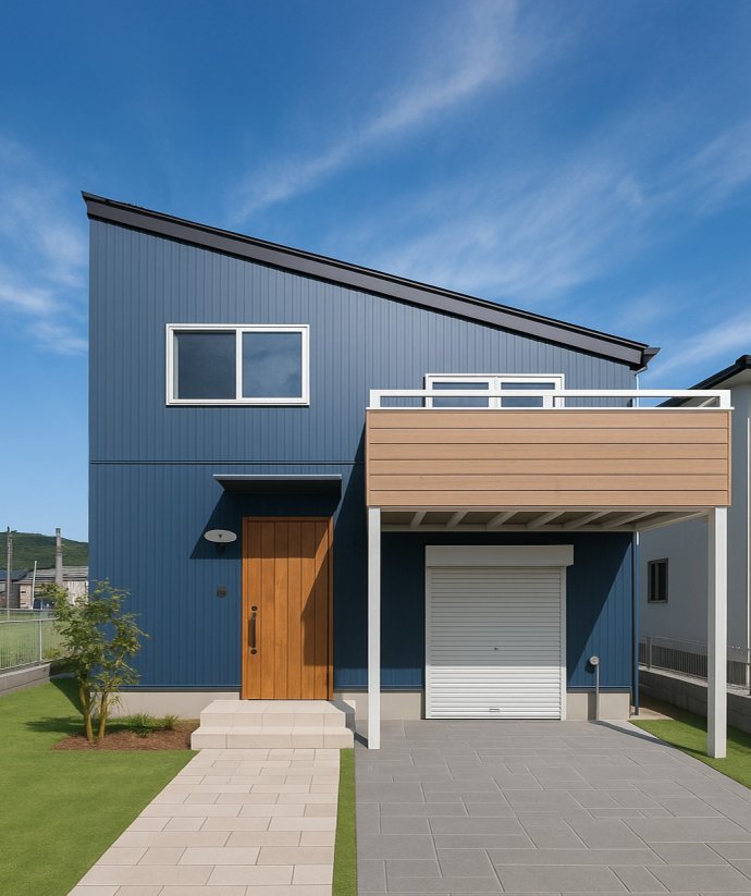 シャープな片流れ屋根とガルバリウム外壁がつくる力強いデザイン。