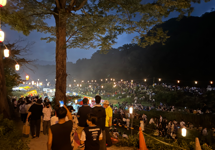 花火会場は長瀞駅から荒川の河川敷に向かい、岩畳という所です。
